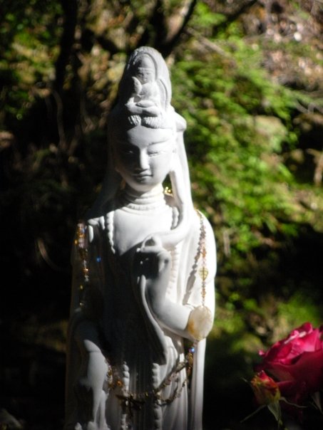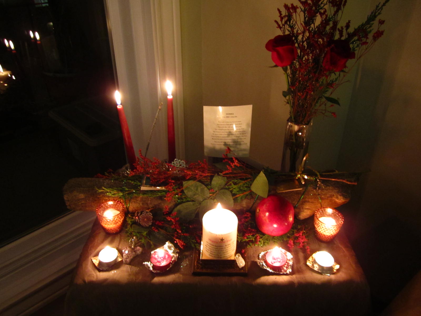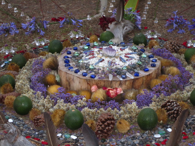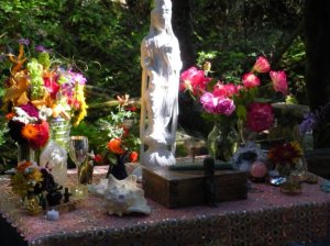 For the smaller at home ones, we seem to focus on the deity and add items around its statue. If it’s a more personal altar, one with an intension of something we want to invoke into our lives we find items of a personal nature, add symbols that represent that, and also add affirmations. For example, if I felt like I needed to develop more compassion I would put Kwan Yin [the female Buddha] in the center, and surround her in rose quartz. I would also add white flowers, white candles, and write affirmations for myself about being compassionate. An altar doesn’t have to have such a specific intension as that though. It could simply just be a representation of your connection to spirit and whatever items you feel drawn to the most to represent that. That way when you take the time out of your day to focus on it you can connect with the energy.