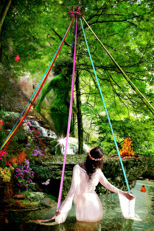 Another celebratory tradition is to dance around the Maypole. The Maypole represents the phallus. Ribbons are attached by a Beltane_by_ArjenHenrycrown of flowers to the top, and then men and women each hold a ribbon weaving in and out as they dance around it wrapping the pole. Men go one direction, women the other. This is to symbolize the enveloping womb of the earth around the pole.
